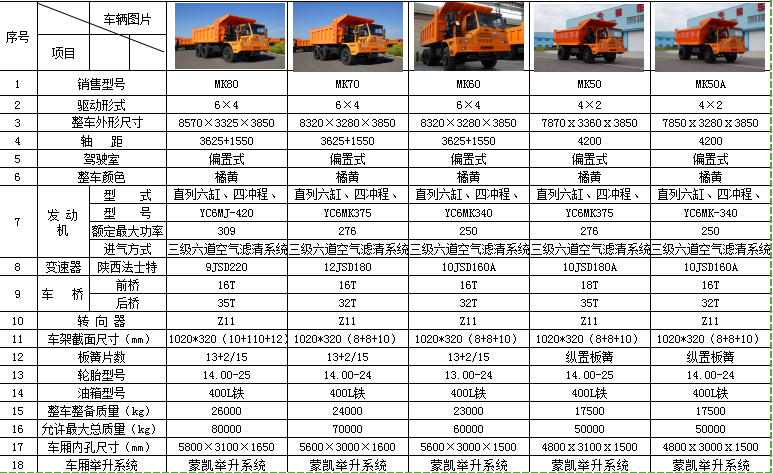 MK50兩軸礦用車以公司MK70平臺打造,國內市場首創(chuàng),填補該類礦用車產品市場的空白。采用行業(yè)內得到廣泛認可的玉柴發(fā)動機、法士特變速箱、車橋承載系統(tǒng)及舒適豪華的駕駛室??捎糜谝苯鸬V山、露天煤礦與鐵礦、水利水電工地、有色金屬礦山、建筑工地等場所的物料運輸設備。